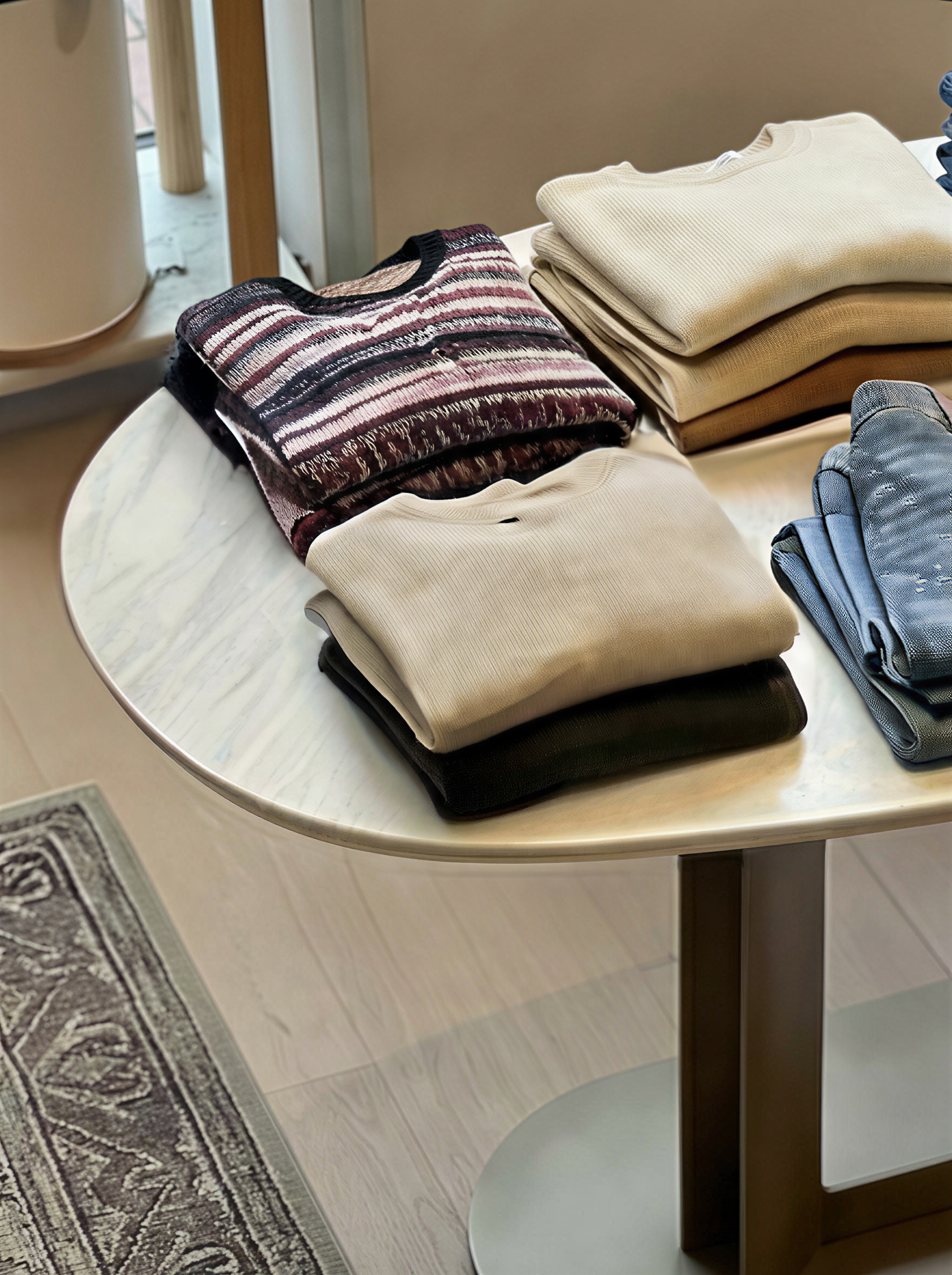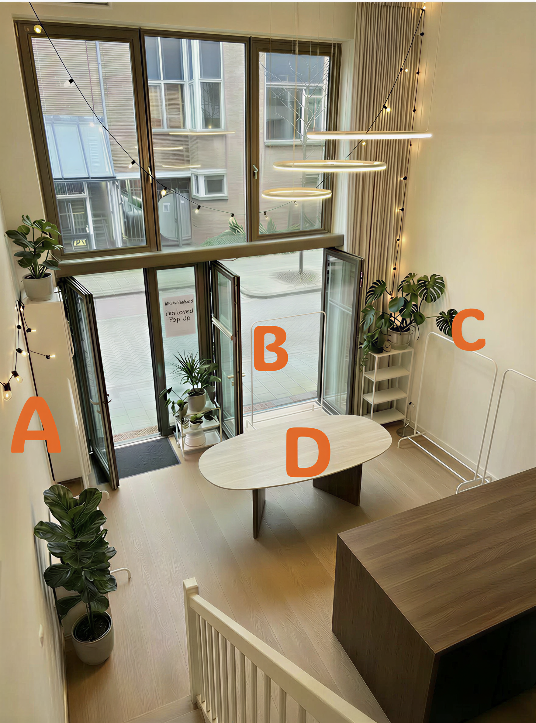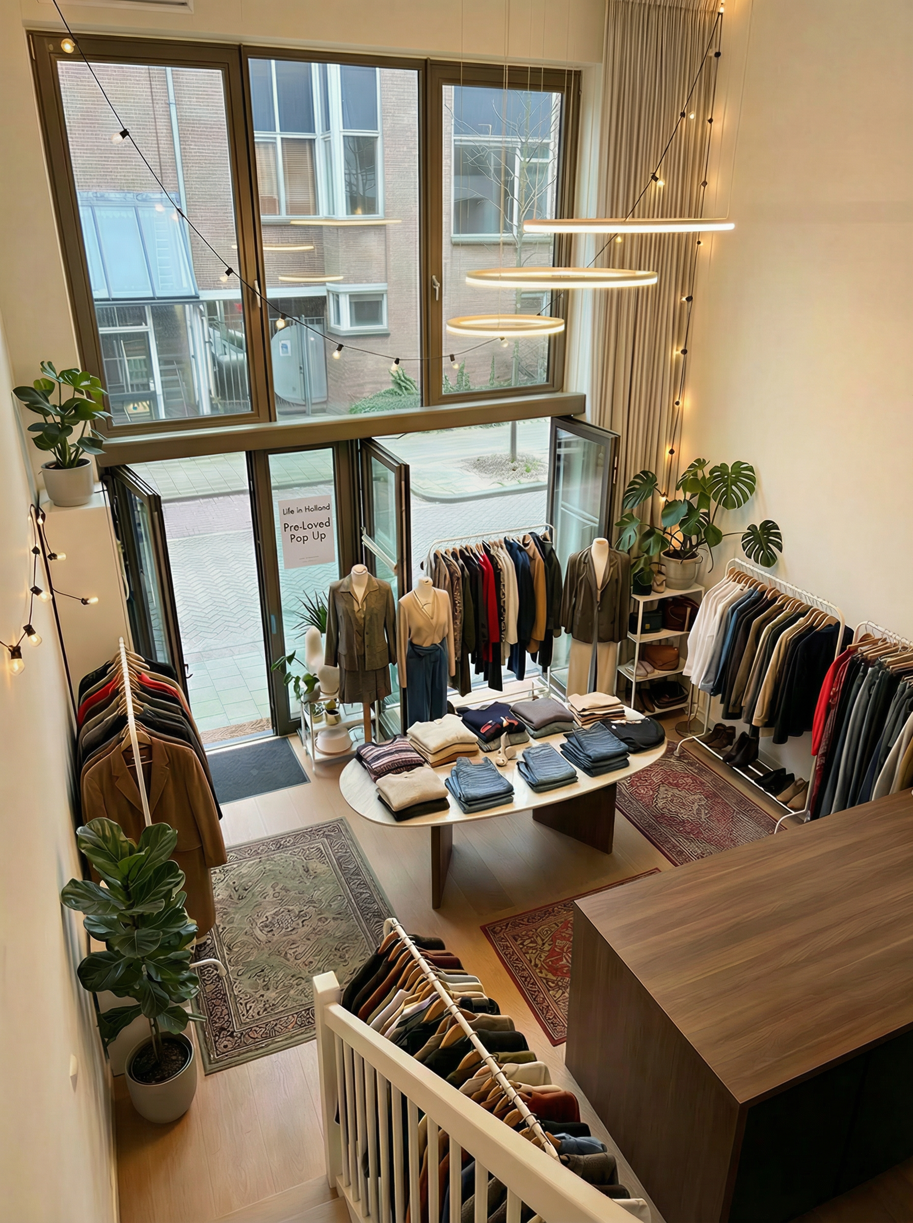 The space & atmosphere you see here is exactly what you can expect in person: Clean, white walls and warm wooden accents paired with two-floor-high ceiling to elevate the pre-loved shopping experience.